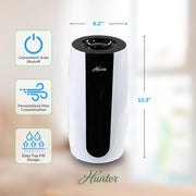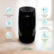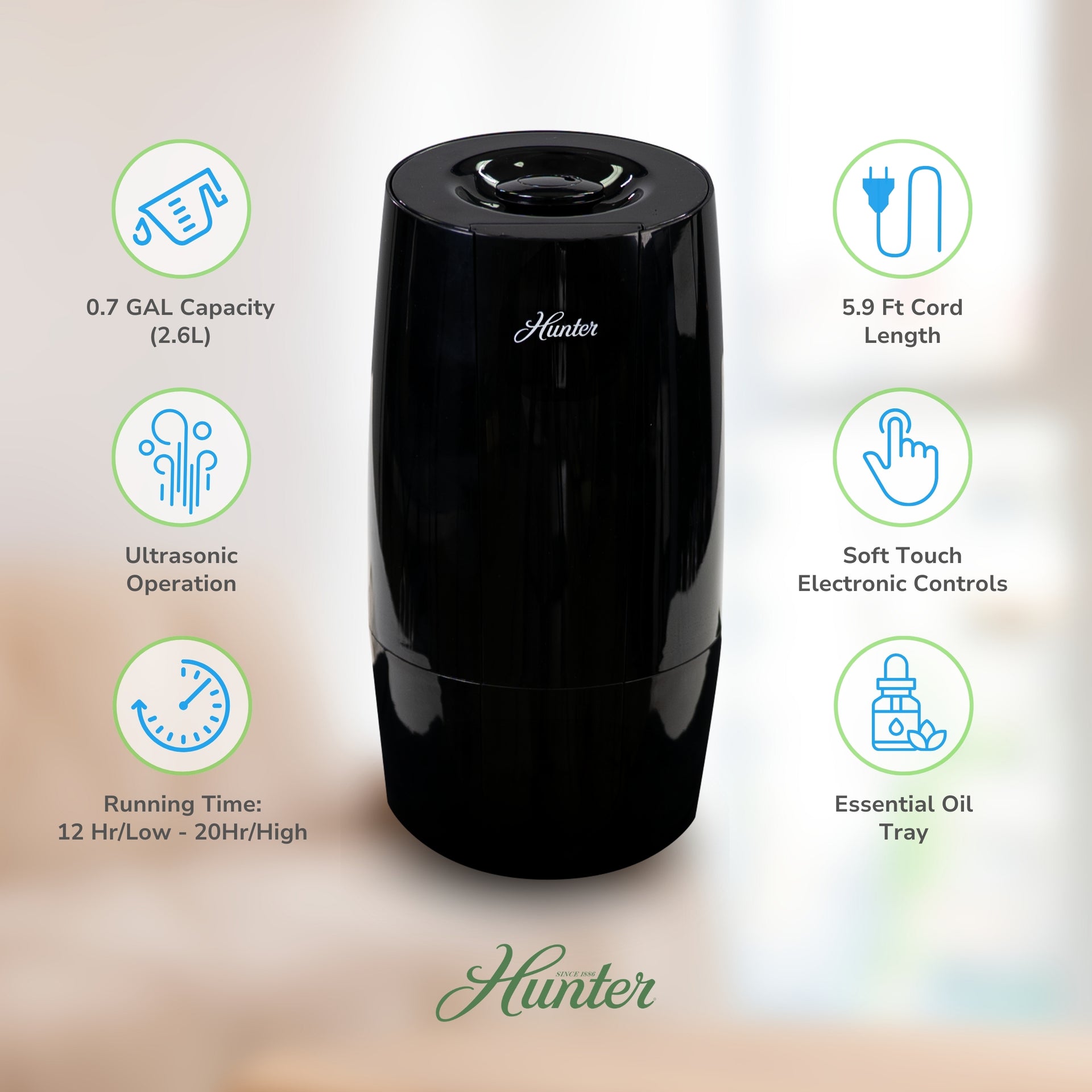 Get ready to turn heads and transform spaces, as we proudly introduce our newest bundle of joy, the adorable Hunter Aspire .7G Humidifier. The irresistible design of this not-so-little device is a perfect blend of style and substance. Despite its cute appearance, it's highly functional. The .7-gallon capacity ensures customizable cool mist humidification for an enjoyable and comfortable environment. Ideal for any home, or office, it's compact yet powerful enough to provide visible and refreshingly cool mist for up to 20 hours. Enjoy the soft glow of its built-in accent light adding an extra touch of comfort to your nighttime routine. Born to make a difference, this super cute .7 gal humidifier is ready to elevate your surroundings and help you live the low-maintenance life -your dry air definitely deserves this treat! Welcome this chic little addition to your family, designed to effortlessly blend functionality with aesthetics from Hunter!