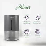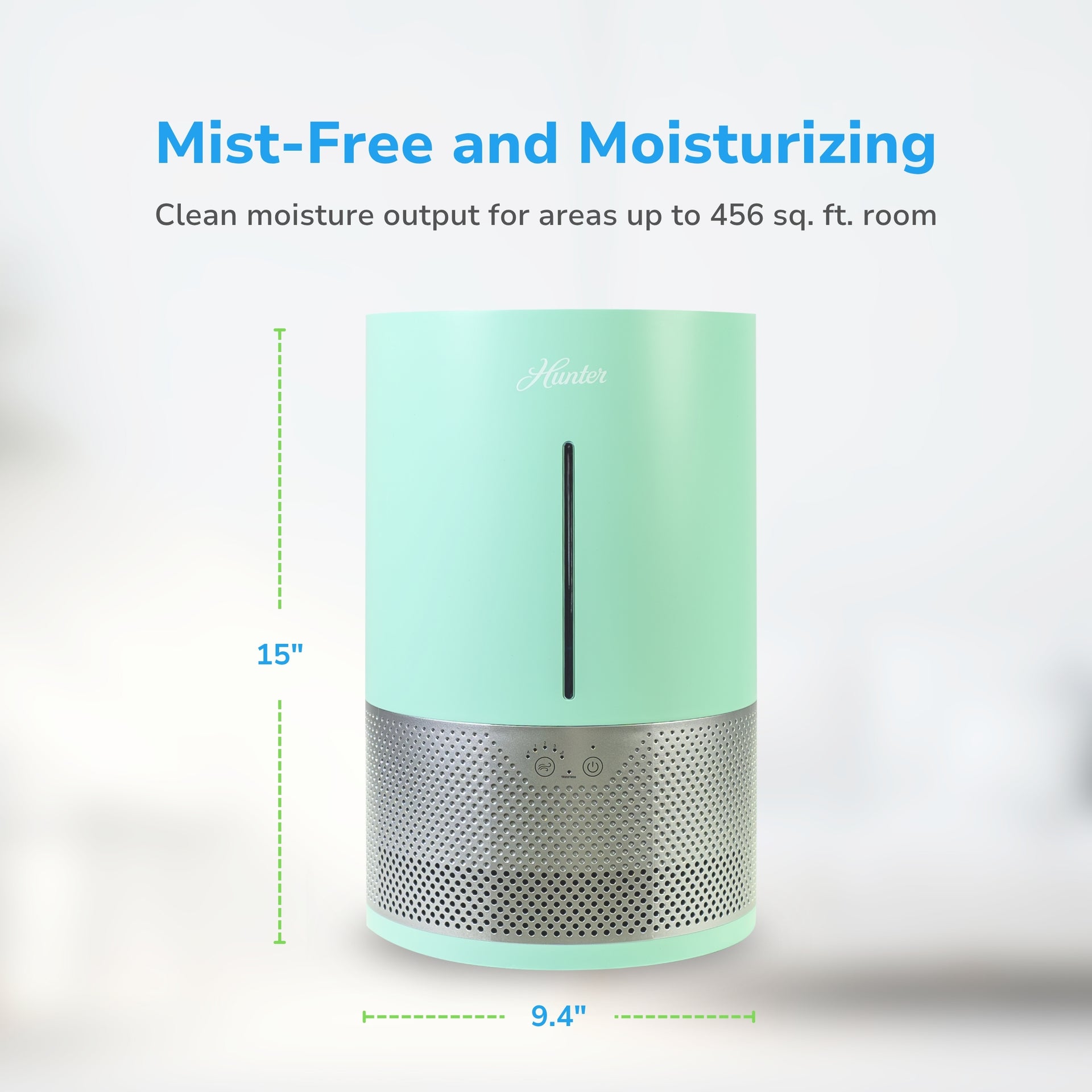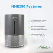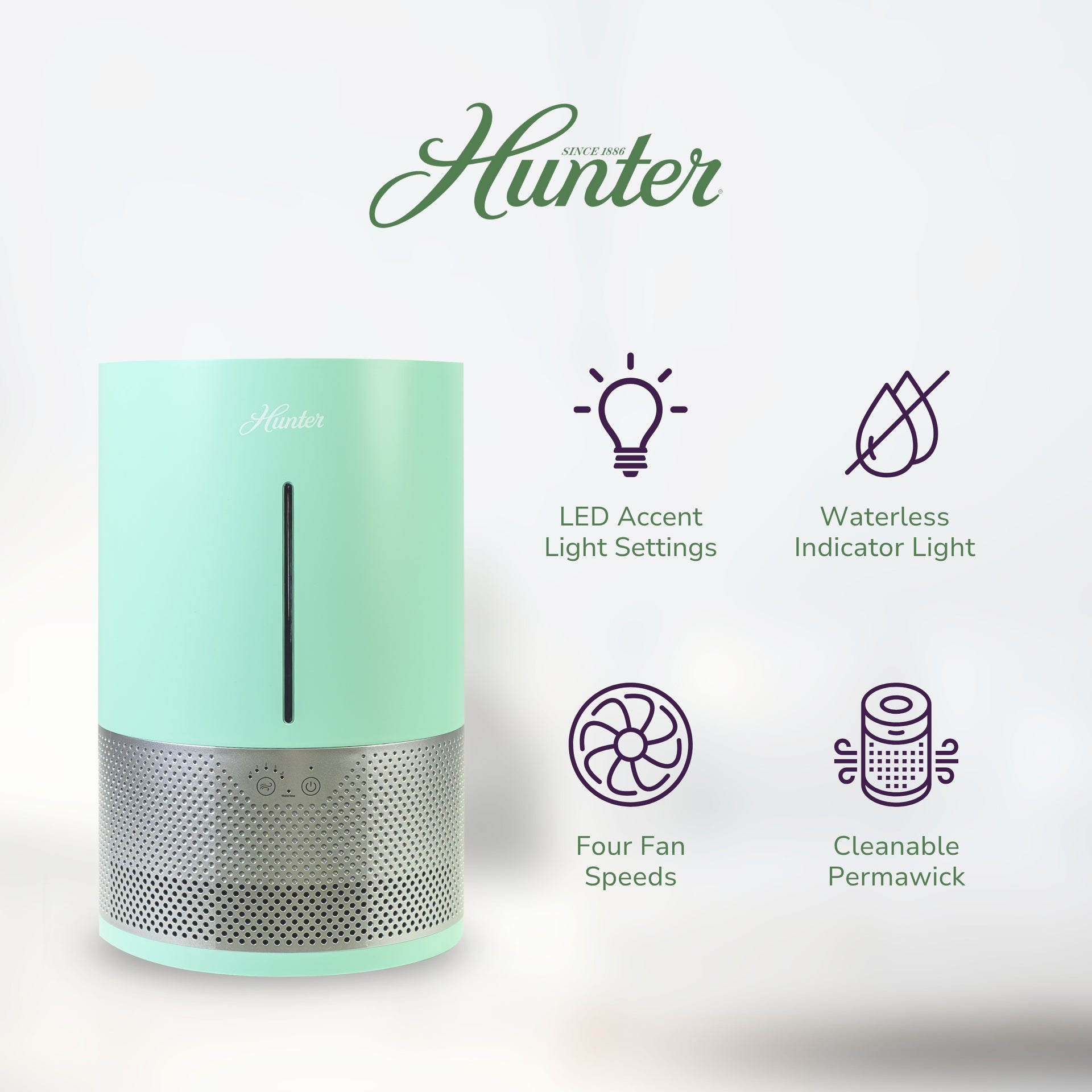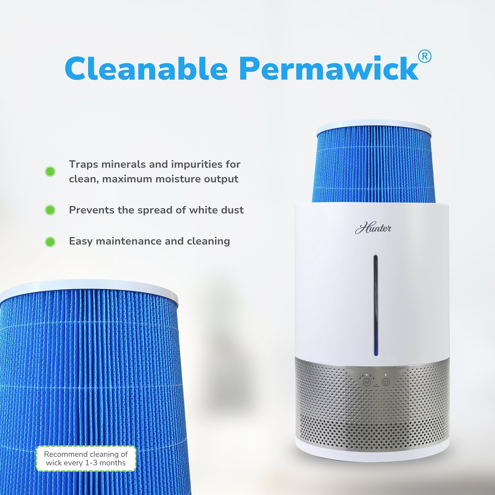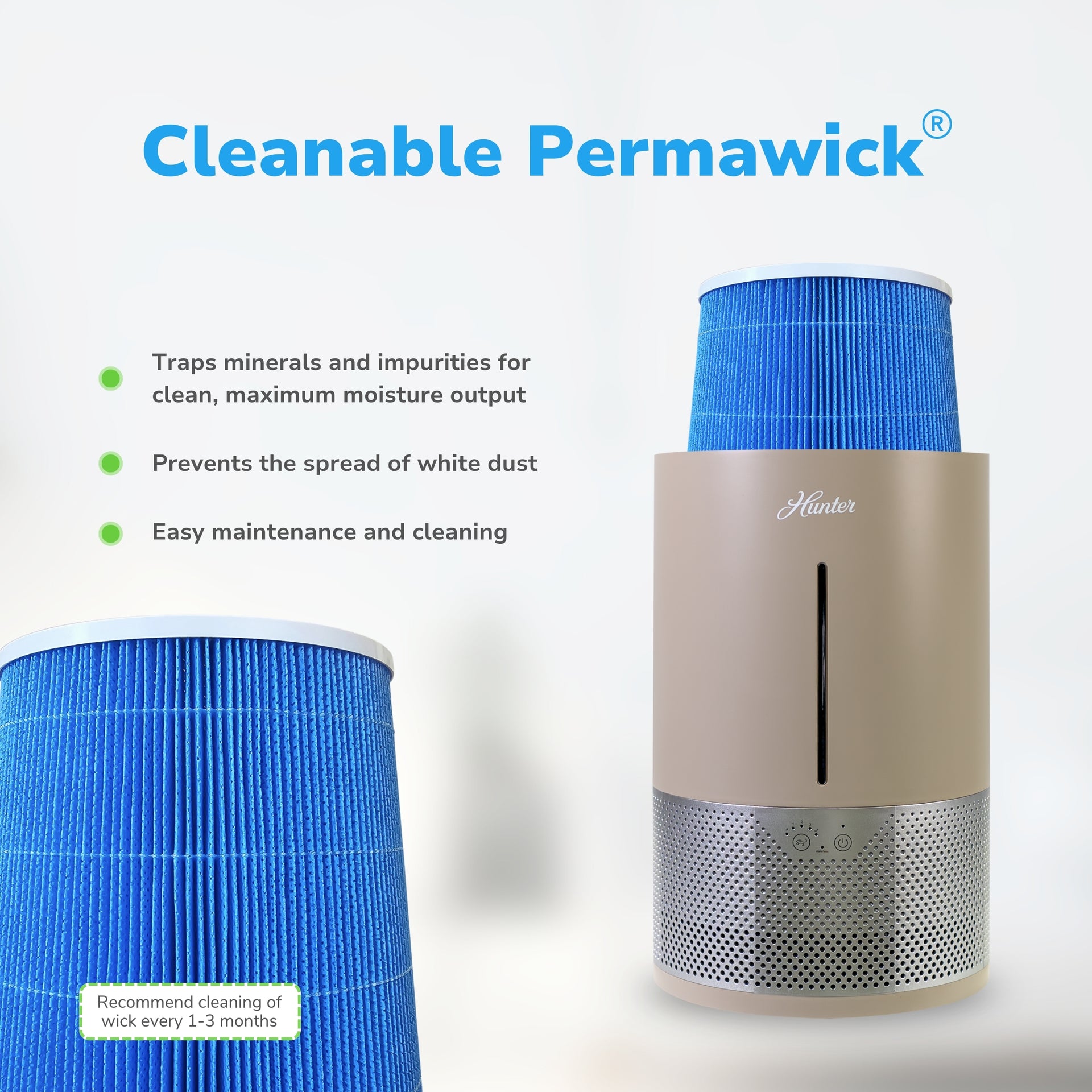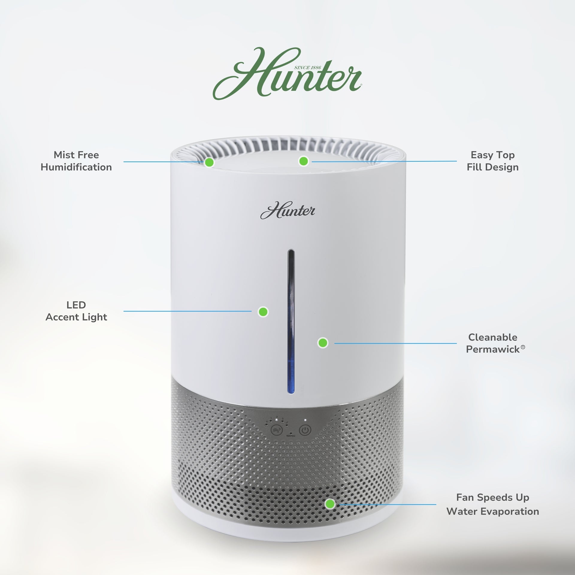 Feel the difference in humidifier delivery and control with the Hunter Aspire Evaporative Humidifier. This advanced mist-free humidifier optimizes your living space using a PermaWick to trap minerals and impurities, ensuring clean moisture output and preventing the spread of white dust. The HHE150 Aspire 4.8L Evaporative Humidifier effectively covers areas up to 456 sq. ft., making it ideal for home or office usage and comes in four colors: graphite; aqua; taupe; and white. Revolutionize your indoor environment with this exceptional humidifier that offers targeted results that cater to your individual needs from Hunter.