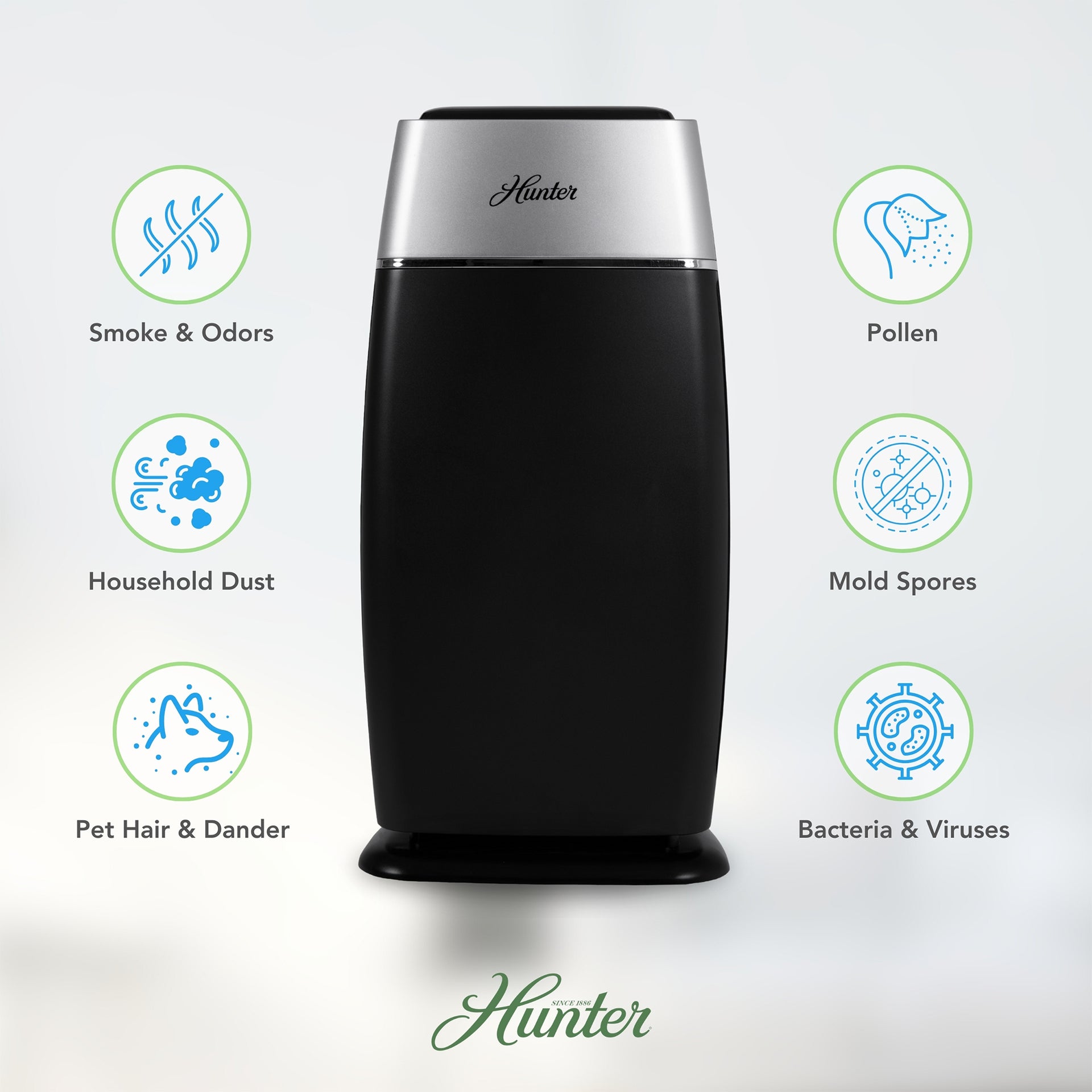 - HIGH EFFICIENCY PURIFICATION: Equipped with a True HEPA filter, Hunter air purifiers for home can capture up to 99.97% of airborne particles and reduce allergens and microorganisms for a healthier home environment.